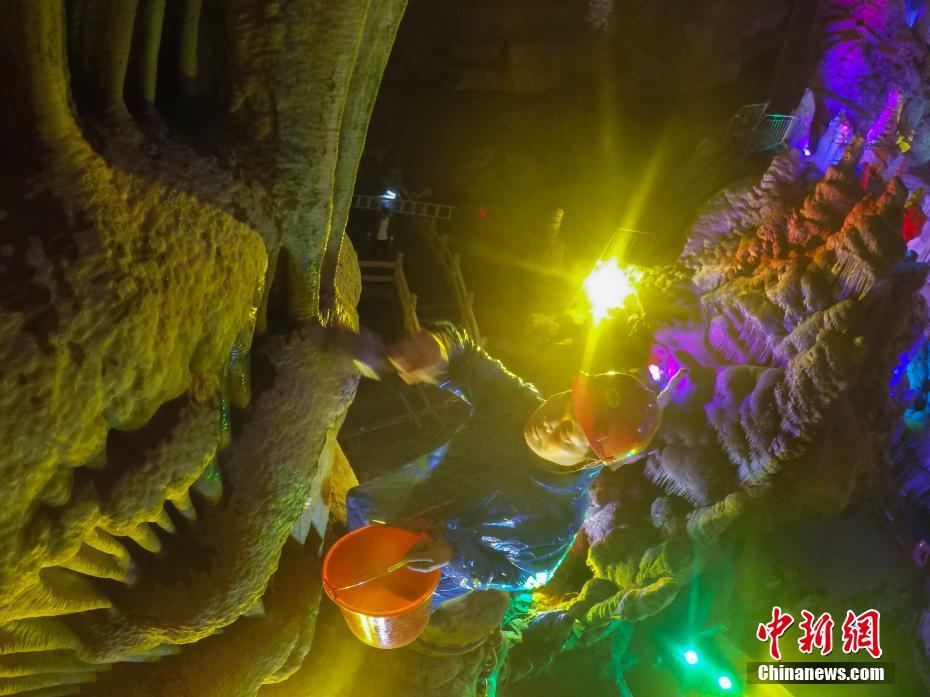 4月29日,五一假期将至,河南洛阳鸡冠洞景区,工作人员对溶洞内的亿年钟乳石进行清洗保养维护。据介绍,河南洛阳鸡冠洞是一座典型的石灰岩溶洞,形成时间达亿年之久,洞内钟乳石千姿百态,景观林立,有着极高的观赏价值和科研价值,被誉为“北国第一洞”。中新社记者 王中举 摄