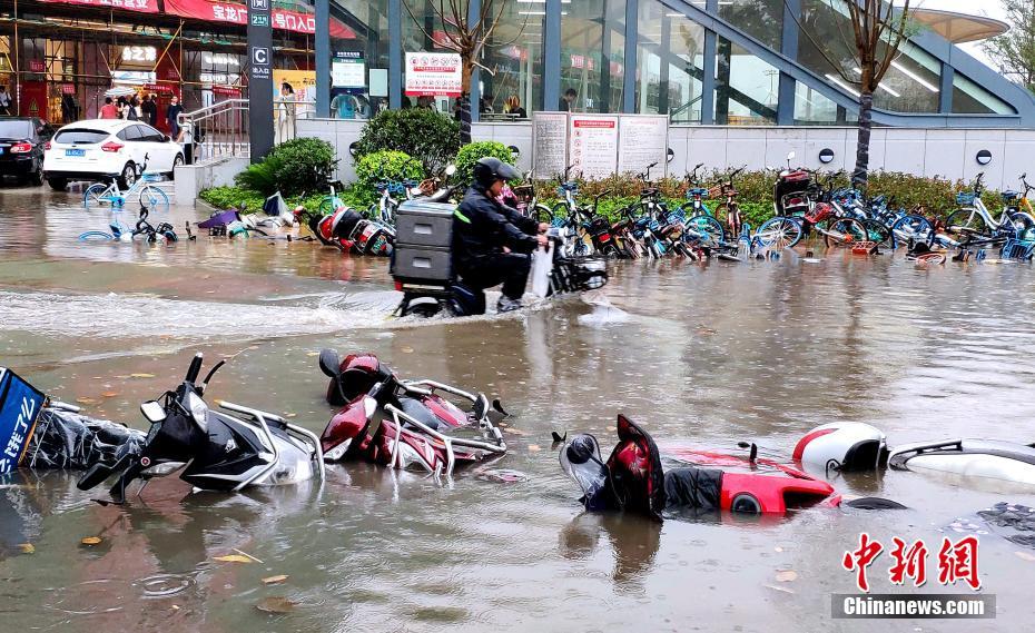 4月30日,一名外卖人员在积水路段骑行。当日,福州突降暴雨,造成市区多条道路严重积水。中新社记者 吕明 摄