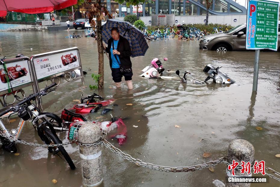 4月30日,行人涉水出行。当日,福州突降暴雨,造成市区多条道路严重积水。中新社记者 吕明 摄