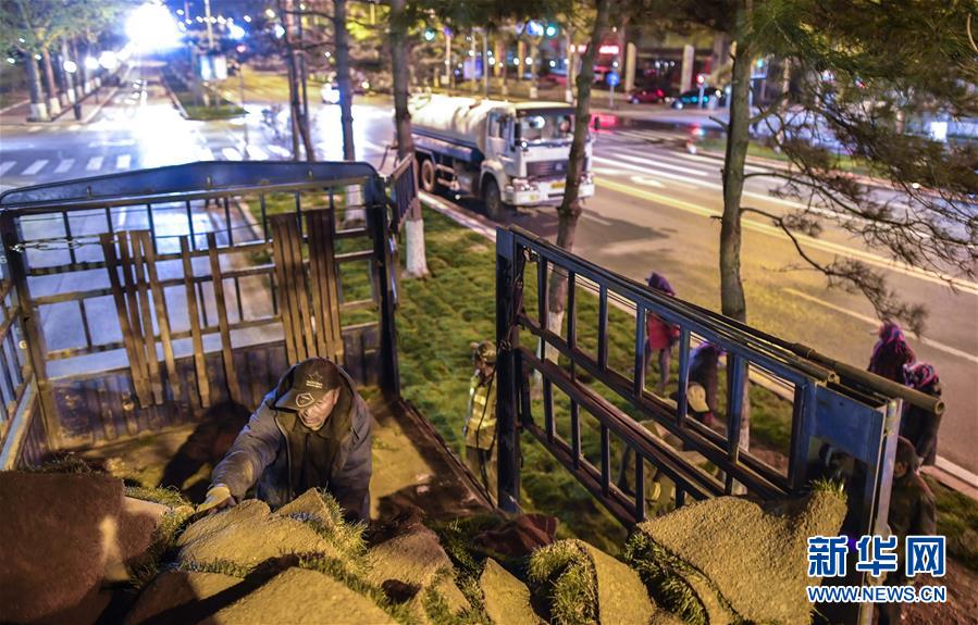 凌晨1点,长春市绿化养护工人为长春市一条主干道两旁的花池铺设草坪(4月25日摄)。 新华社记者许畅摄