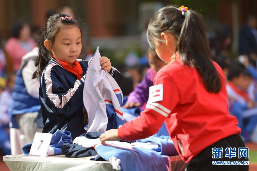 4月30日,天津市和平区新星小学学生在进行叠衣服比赛。 “五一”劳动节前夕,各地小学举办小学生劳动技能竞赛,小学生通过叠衣服、缝制布袋、做拼盘等形式多样的劳动技能比赛,体验参与劳动的乐趣。 新华社发(刘东岳 摄)