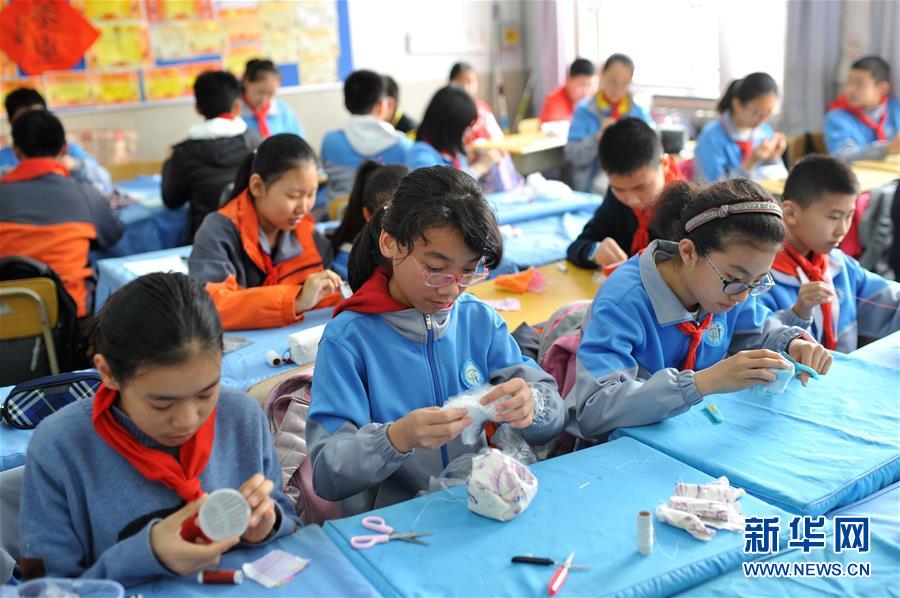 4月30日,山东青岛桦川路小学学生在进行缝制布袋比赛。 “五一”劳动节前夕,各地小学举办小学生劳动技能竞赛,小学生通过叠衣服、缝制布袋、做拼盘等形式多样的劳动技能比赛,体验参与劳动的乐趣。 新华社发(王海滨 摄)