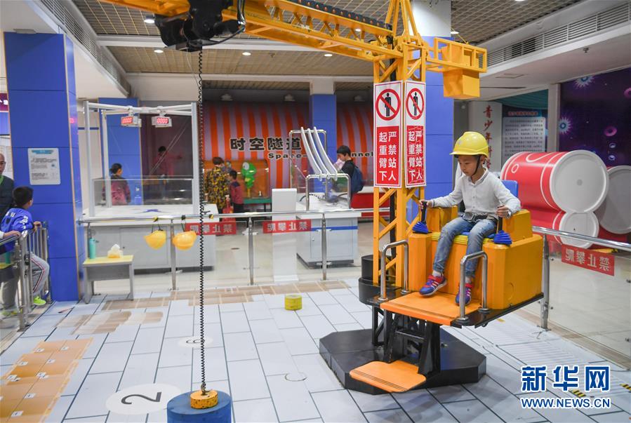 5月1日,小朋友在福建省科技馆体验“塔吊司机”工作。 新华社记者 宋为伟 摄