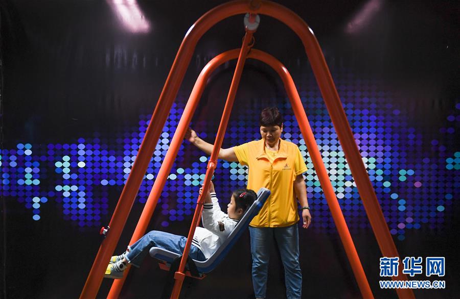 5月1日,在福建省科技馆,小朋友在志愿者的帮助下体验电磁秋千。 新华社记者 宋为伟 摄