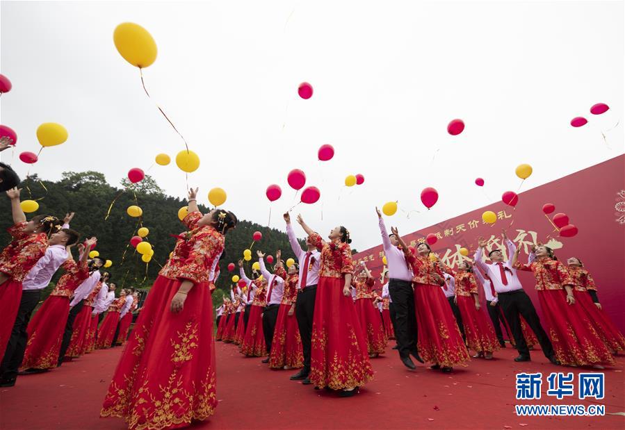 4月30日,新人在集体婚礼上放飞气球。 当日,江西省新余市渝水区46对青年男女在良山镇下保村举行集体婚礼。他们在青山绿水的见证下喜结连理,用行动倡导文明节俭办婚礼。 新华社发(赵春亮 摄)