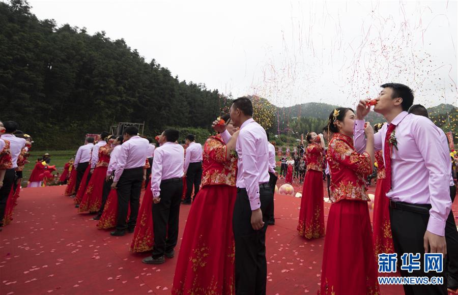 4月30日,新人在集体婚礼上共饮交杯酒。 当日,江西省新余市渝水区46对青年男女在良山镇下保村举行集体婚礼。他们在青山绿水的见证下喜结连理,用行动倡导文明节俭办婚礼。 新华社发(赵春亮 摄)