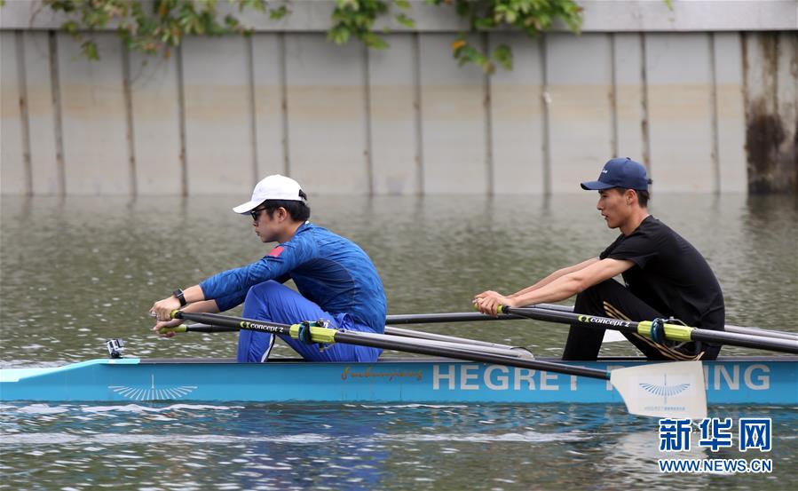 这是4月17日,肖国勋(左)和教练在大沙河训练。新华社记者 李莹 摄