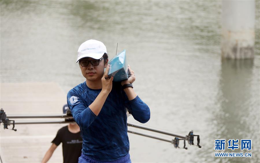 这是4月17日,肖国勋在训练结束后将船艇扛回船库。新华社记者 毛思倩 摄