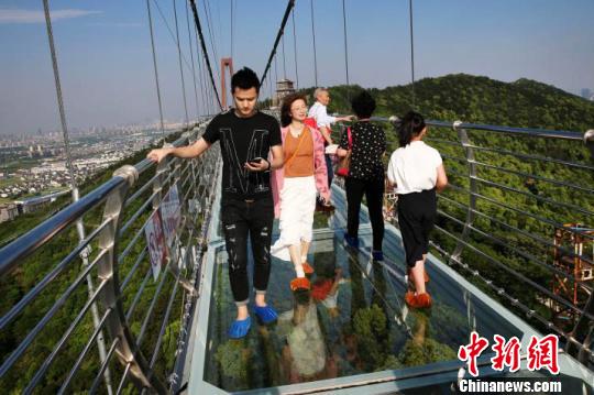 5月4日,江苏华西世界探险公园内,众多游客前来体验凌空玻璃桥。该玻璃桥全长518米,桥面净长度430米,走在上面,似凌空漫步。
