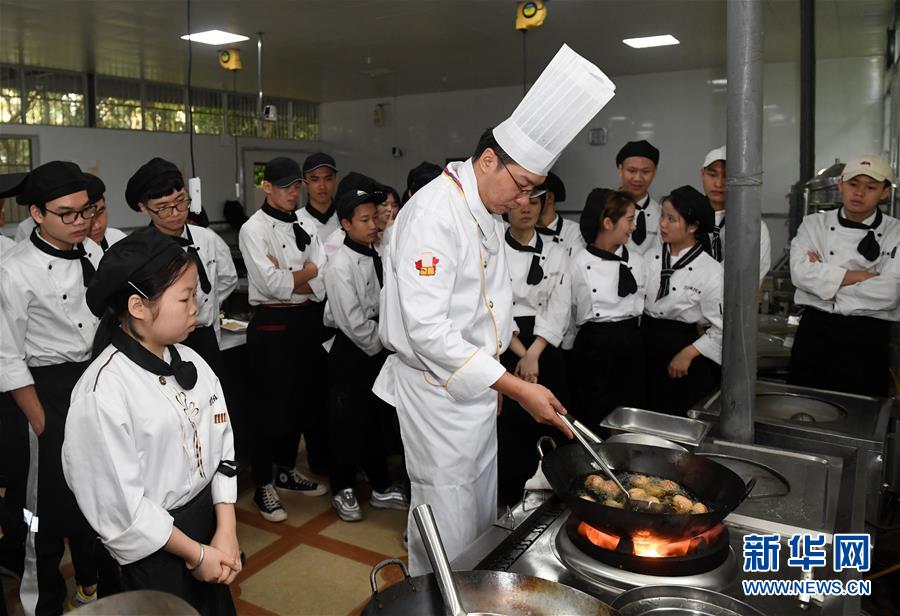 5月7日,在广西经贸职业技术学院,钟娇娇(前左)和同学在实操课上学习。 20岁的钟娇娇出生在广西南宁市良庆区良庆镇那平村。她出生三个半月就被诊断为重型地中海贫血,一直靠接受输血维持生命。 2017年,媒体对钟娇娇的不幸遭遇进行报道后,引起社会关注。当时,在读高中的钟娇娇下定决心要像普通人一样参加高考。功夫不负有心人,2018年,钟娇娇通过高考进入了广西经贸职业技术学院学习烹饪工艺与营养学专业。现在的钟娇娇非常珍惜来之不易的校园生活。她坚信,只要心中有梦想,青春定会精彩绽放。 新华社记者陆波岸 摄
