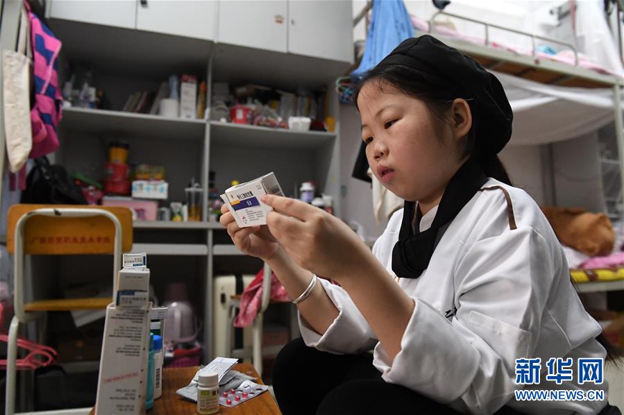 5月7日,在广西经贸职业技术学院,钟娇娇在宿舍里准备服用药品。 20岁的钟娇娇出生在广西南宁市良庆区良庆镇那平村。她出生三个半月就被诊断为重型地中海贫血,一直靠接受输血维持生命。 2017年,媒体对钟娇娇的不幸遭遇进行报道后,引起社会关注。当时,在读高中的钟娇娇下定决心要像普通人一样参加高考。功夫不负有心人,2018年,钟娇娇通过高考进入了广西经贸职业技术学院学习烹饪工艺与营养学专业。现在的钟娇娇非常珍惜来之不易的校园生活。她坚信,只要心中有梦想,青春定会精彩绽放。 新华社记者陆波岸 摄