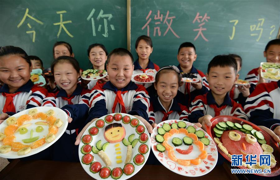 5月7日,河北省邯郸市光明南小学的学生展示自制的“果蔬笑脸”。当日,各地学校举办丰富多彩的“微笑”主题活动,迎接5月8日世界微笑日的到来。新华社发(郝群英 摄)