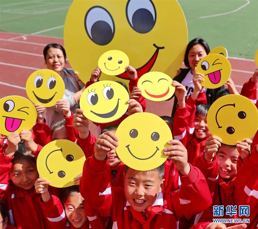5月7日,河北省秦皇岛市河东小学的学生在展示笑脸卡。当日,各地学校举办丰富多彩的“微笑”主题活动,迎接5月8日世界微笑日的到来。新华社发(曹建雄 摄)