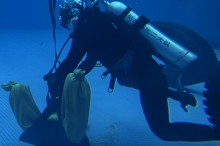 图为江西省乐平市蓝天救援志愿者协会队员在开放水域潜水打捞项目中将假人打捞上岸。新华网 李相博 摄
