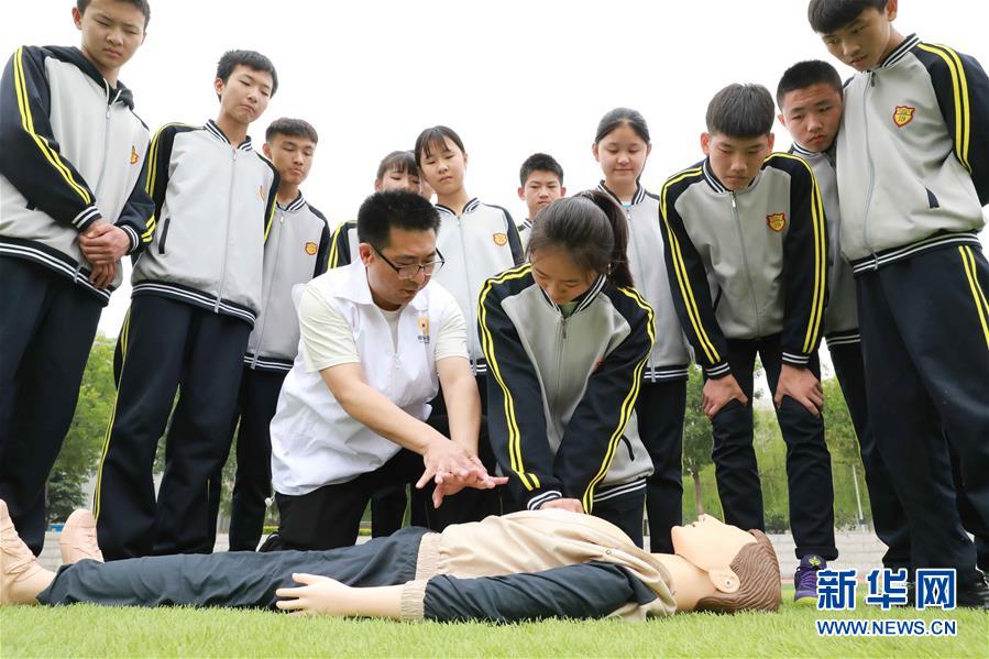 5月8日,在河北省邢台市第十九中学,学生在红十字会医务人员的指导下学习急救技能。5月8日是世界红十字日。新华社发(王贤亮 摄)