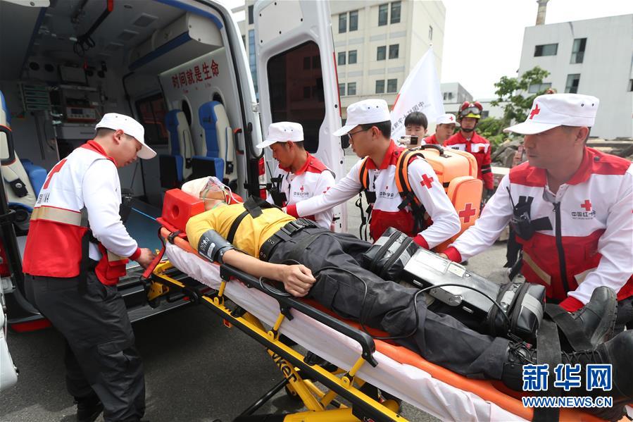 5月8日,在浙江绍兴举行的中国红十字会应急救援综合演练上,救援人员将“伤员”送上救护车。5月8日是世界红十字日。 新华社发(章斌 摄)