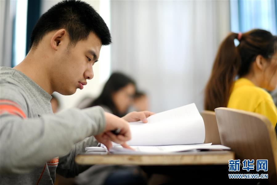 5月8日,李硕(中)在东北林业大学丹青楼311教室与同学一起复习功课。新华社记者 王松 摄