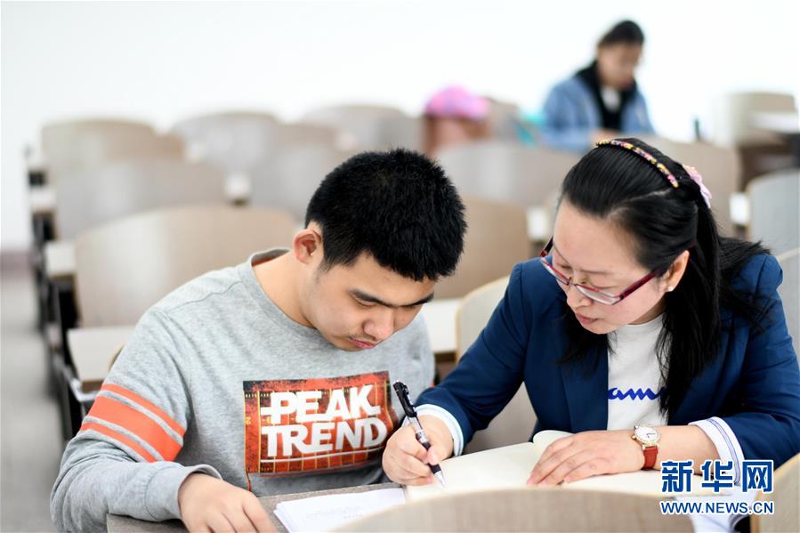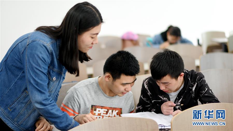 5月8日,在东北林业大学丹青楼311教室,老师在课间为李硕(左)补习。新华社记者 王松 摄