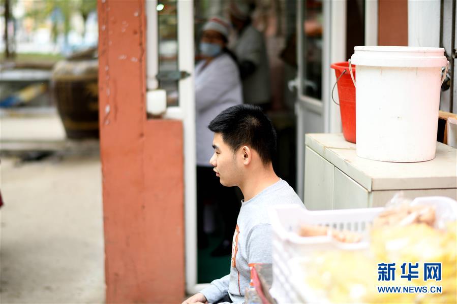 5月8日,李硕在东北林业大学校园内等待在学校早餐铺工作的妈妈。新华社记者 王松 摄