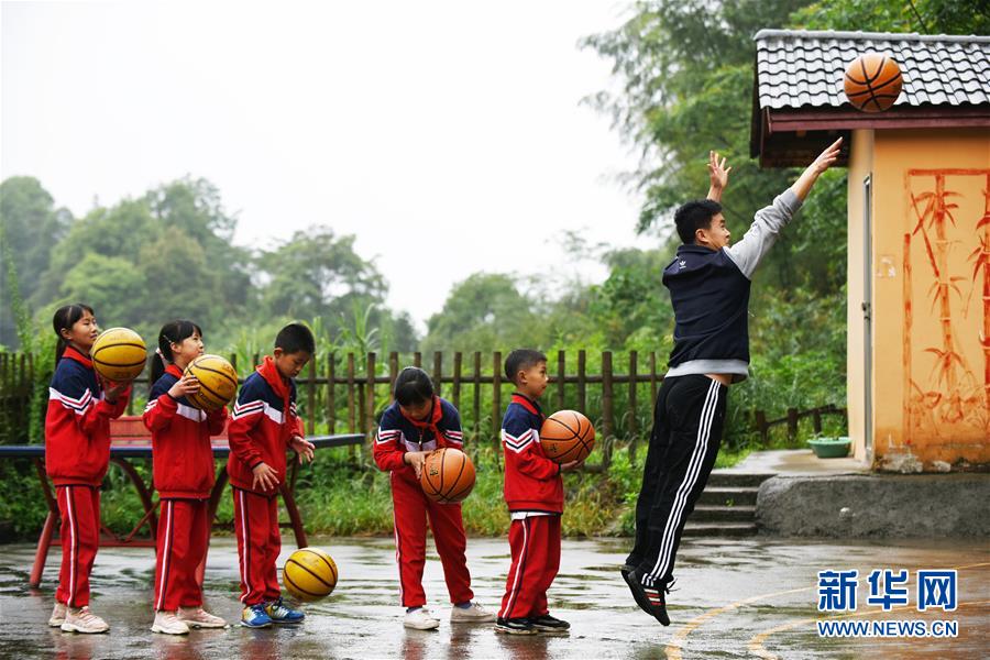 5月9日,周正文(右一)与学生在体育课上练习投篮。 新华社记者 杨文斌 摄