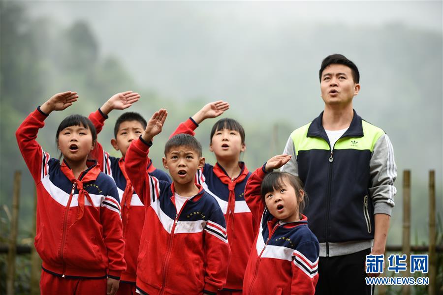 5月9日,周正文(右一)与学生在升旗仪式上。 新华社记者 杨文斌 摄