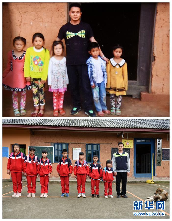 拼版照片:上图为2014年周正文与学生在杨柳小学前的合影(翻拍照片);下图为5月9日,周正文与学生在杨柳小学前的合影(新华社记者 杨文斌 摄)。 新华社发
