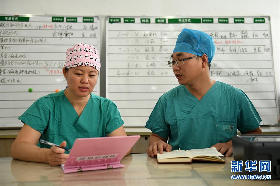 5月9日,在石家庄市妇产医院,手术室副护士长张泽扬(右)与护士长侯玲(左)交流业务。 在河北省石家庄市妇产医院,有一群平均年龄二十多岁的男护士,同事们亲切地称他们为“男丁格尔”,他们用自己所学的医学技术迎接着一个又一个新生命。 近年来,石家庄市妇产医院的男护士在工作中扮演着越来越重要的角色,全院20余名男护士工作在一线岗位上,默默地奉献和付出。张泽扬是男护士中年龄较大的,1988年出生的他如今已成长为手术室副护士长。“每一场手术都是一次考验,不得有丝毫马虎,力气活要顶上,细致活要精通,面对危险紧急时刻更要冷静有担当。只有看到母子平安,我们的心才能放下来。”张泽扬说。 新华社发(陈其保 摄)