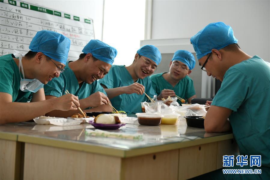 5月9日,在石家庄市妇产医院,男护士们在手术后吃午餐。 在河北省石家庄市妇产医院,有一群平均年龄二十多岁的男护士,同事们亲切地称他们为“男丁格尔”,他们用自己所学的医学技术迎接着一个又一个新生命。 近年来,石家庄市妇产医院的男护士在工作中扮演着越来越重要的角色,全院20余名男护士工作在一线岗位上,默默地奉献和付出。张泽扬是男护士中年龄较大的,1988年出生的他如今已成长为手术室副护士长。“每一场手术都是一次考验,不得有丝毫马虎,力气活要顶上,细致活要精通,面对危险紧急时刻更要冷静有担当。只有看到母子平安,我们的心才能放下来。”张泽扬说。 新华社发(陈其保 摄)