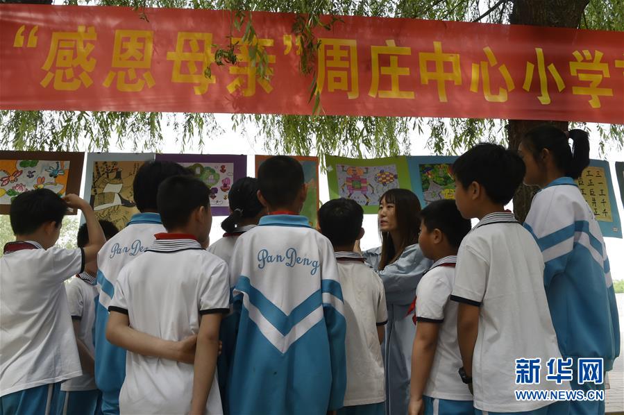 5月10日,在香河县安平镇周庄中心小学,学生们在课间休息时参观展出的“感恩母亲”绘画作品。母亲节即将到来,河北省香河县安平镇周庄中心小学举办“感恩母亲”艺术节活动,小学生们拿起画笔,创作绘画和书法作品,展现学习成果,表达对母亲的感恩之情。新华社记者 鲁鹏 摄