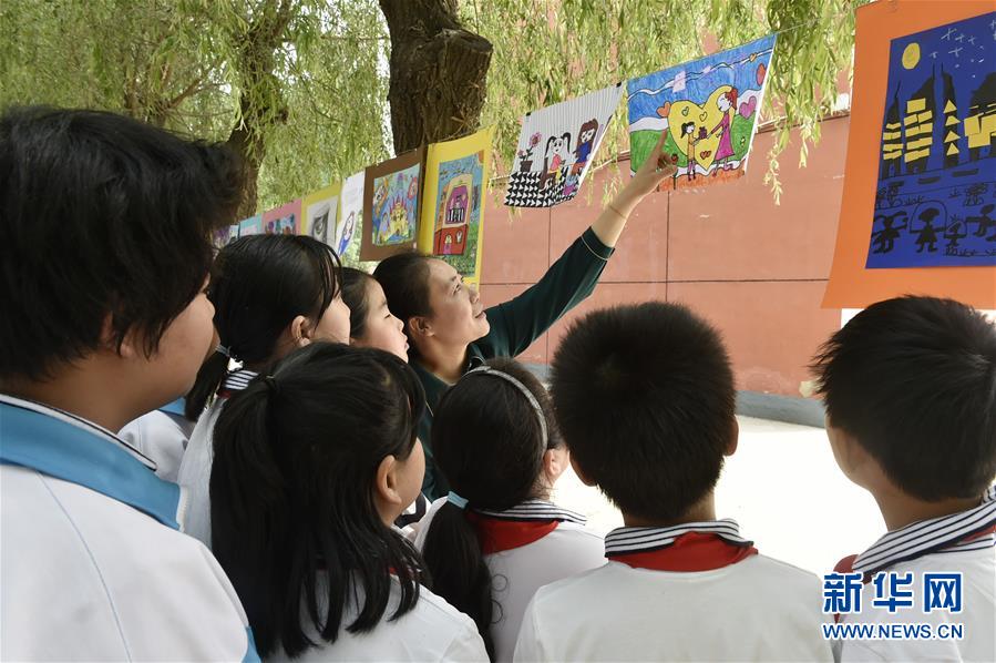 5月10日,在香河县安平镇周庄中心小学,一名老师在课间休息时为学生们介绍展出的“感恩母亲”绘画作品。母亲节即将到来,河北省香河县安平镇周庄中心小学举办“感恩母亲”艺术节活动,小学生们拿起画笔,创作绘画和书法作品,展现学习成果,表达对母亲的感恩之情。新华社记者 鲁鹏 摄