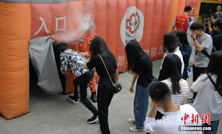 5月11日,中国“防灾减灾日”来临之际,四川省“5.12”防灾减灾日主题科普宣传周活动在成都启动,现场科普活动吸引了不少民众参与,通过参观和体验进一步提升民众的火灾防范意识和应急避险、逃生自救能力。图为民众现场体验火场烟雾逃生。中新社记者 刘忠俊 摄