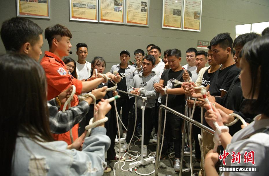 5月11日,中国“防灾减灾日”来临之际,四川省“5.12”防灾减灾日主题科普宣传周活动在成都启动,现场科普活动吸引了不少民众参与,通过参观和体验进一步提升民众的火灾防范意识和应急避险、逃生自救能力。图为逃生讲解员现场教参展者们学习打逃生绳结。中新社记者 刘忠俊 摄