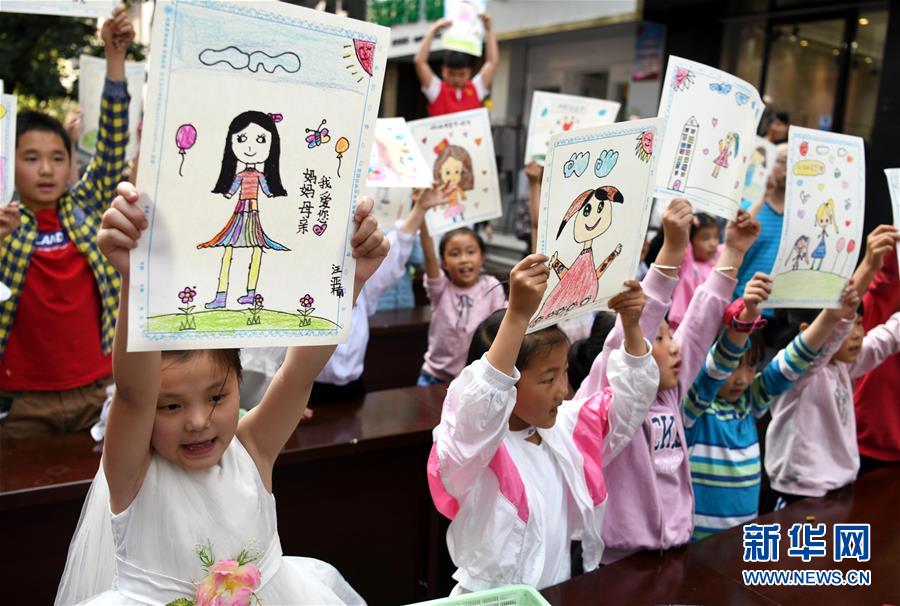 5月11日,肥西县上派镇新华社区小朋友在展示“描绘心中的妈妈”作品。 新华社记者刘军喜摄