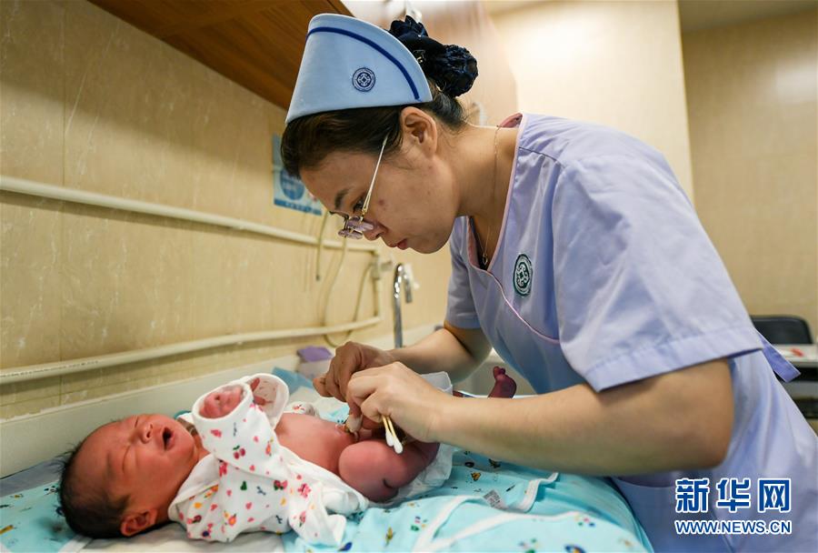 杨晓玲为洗完澡的新生儿穿衣服(5月9日摄)。新华社记者 彭源 摄