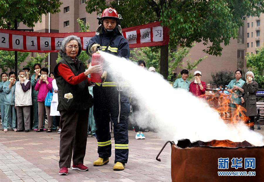 5月14日,养老院里的老年人在消防员的协助下学习使用灭火器材。 新华社记者 陈飞 摄