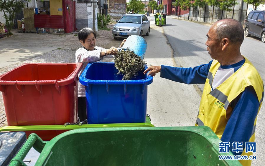 5月14日,在文安县赵各庄镇李各庄村,村民将垃圾放进分类垃圾桶。 今年以来,河北省文安县试点开展农村“垃圾不落地”行动,先后选定4个乡镇共计26个村庄进行试点,使当地农村生活环境逐步走向洁净美。 新华社记者 李晓果 摄