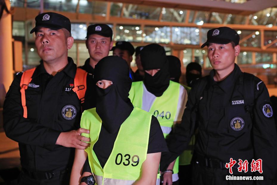 5月14日晚22时许,随着一架中国民航客机缓缓降落在上海浦东国际机场,57名系列社交电信网络诈骗案犯罪嫌疑人被上海警方从海南儋州押解回上海。中新社记者 殷立勤 摄