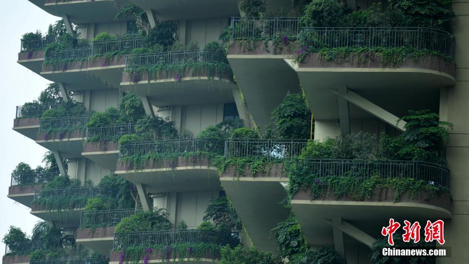 5月14日拍摄的四川成都“垂直森林”住宅小区,满目郁郁葱葱。图为高楼平台上栽种了不少植物。中新社记者 刘忠俊 摄