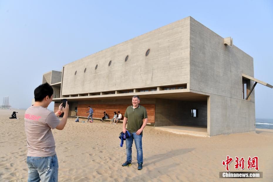 5月15日下午,位于河北秦皇岛北戴河新区一处海边的沙滩上,一座被网友们称作“最孤独的图书馆”吸引着来自四面八方的读者。图为一位德国游客在图书馆外拍照留念。中新社记者 翟羽佳 摄