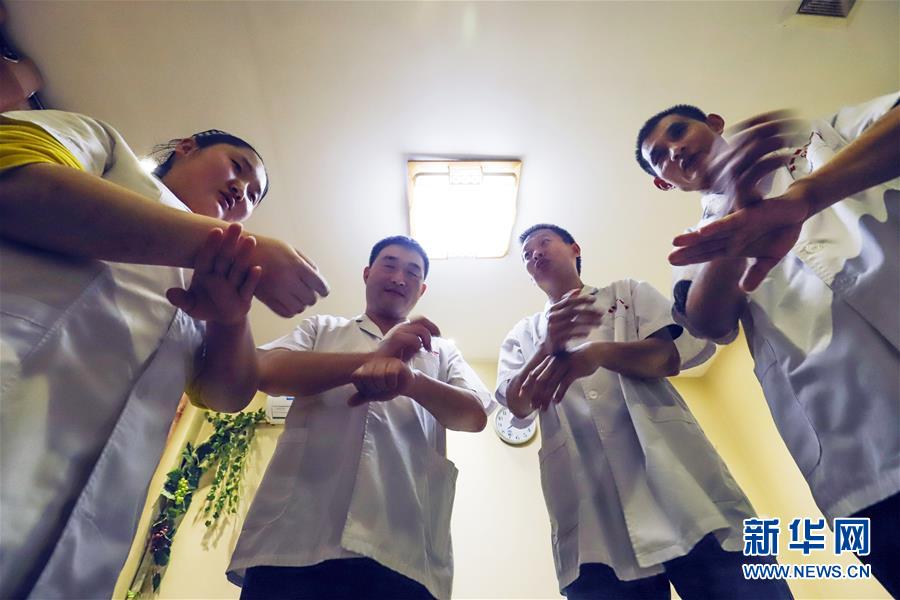张力军(左二)在与按摩师傅交流按摩手法(5月14日摄)。 新华社发(刘满仓 摄)