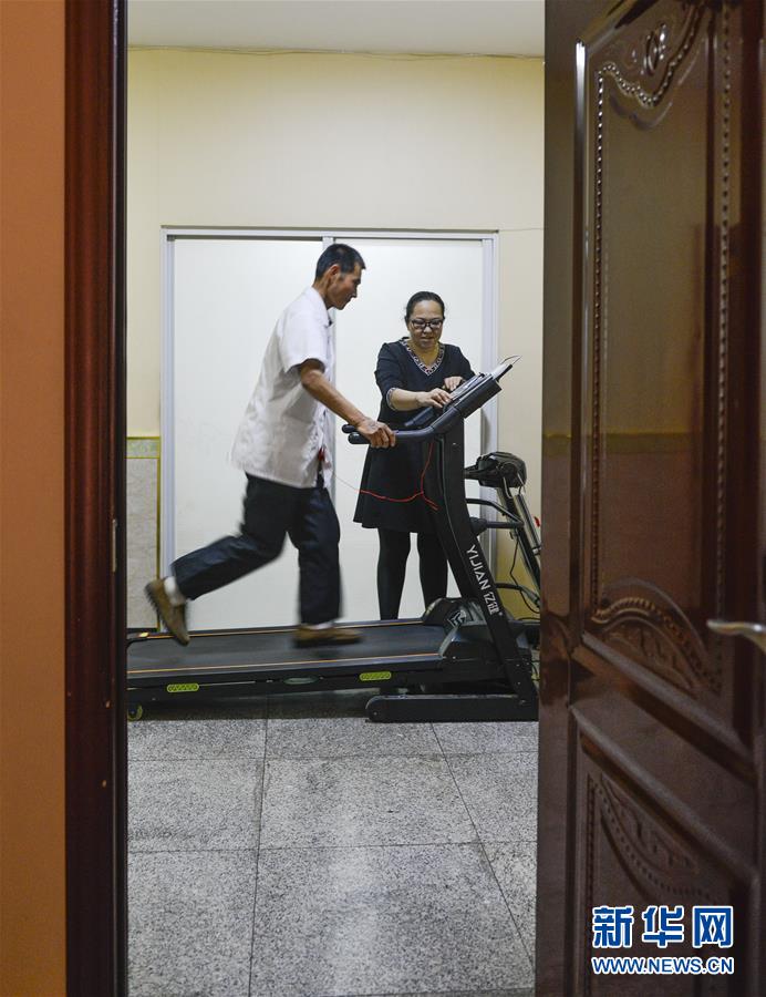 张力军妻子郭春侠(右)在按摩店里帮助按摩师傅卢玉军调试跑步机(5月14日摄)。按摩师是一个辛苦的职业,张力军希望尽可能地给师傅们创造好的工作环境。 新华社发(刘满仓 摄)