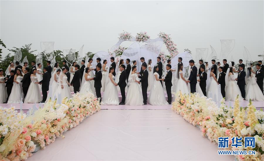 5月19日,新人们在集体婚礼现场。 当日,来自中铁二十四局的32对新人齐聚上海顾村公园,在公园里举办了一场浪漫而特殊的集体婚礼。 新华社记者 丁汀 摄