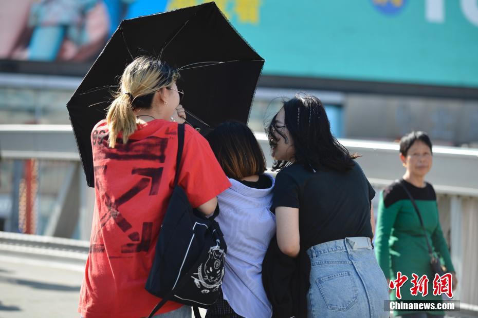 5月20日,北京大风天持续,市民出行撑伞避风。当日,北京的大风蓝色预警持续生效,北京气象部门表示,当日北风劲吹,阵风仍有7至8级,民众出行需注意防风避险,防范高空坠物。中新社记者 张兴龙 摄