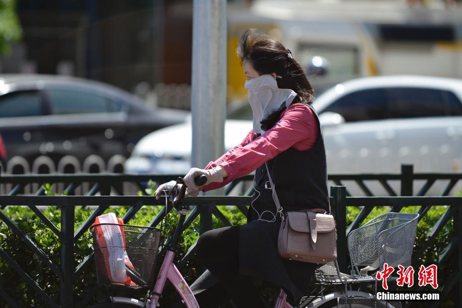 5月20日,北京大风天持续,市民风中出行。当日,北京的大风蓝色预警持续生效,北京气象部门表示,当日北风劲吹,阵风仍有7至8级,民众出行需注意防风避险,防范高空坠物。中新社记者 张兴龙 摄