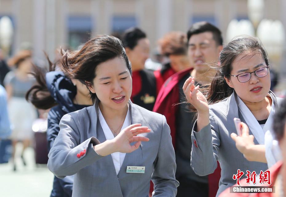 5月20日,北京大风天气持续,市民在风中出行。当日,北京市气象台继续发布大风蓝色预警。中新社记者 贾天勇 摄