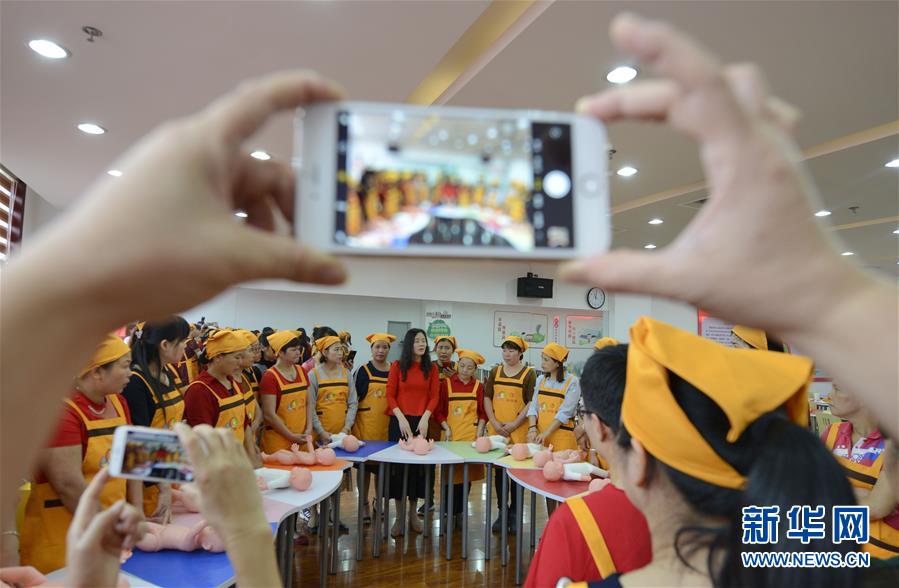 5月21日,在福建省泉州市泉港区妇女儿童活动中心,学员录制培训老师的指导过程。 为提升广大农村妇女就业技能,近日,福建省泉州市泉港区举办“月嫂培训班”,分批免费为辖区110多名待业妇女提供产妇护理、新生儿护理等家政服务技能培训,并就近推荐就业。 新华社发(林弘梫 摄)