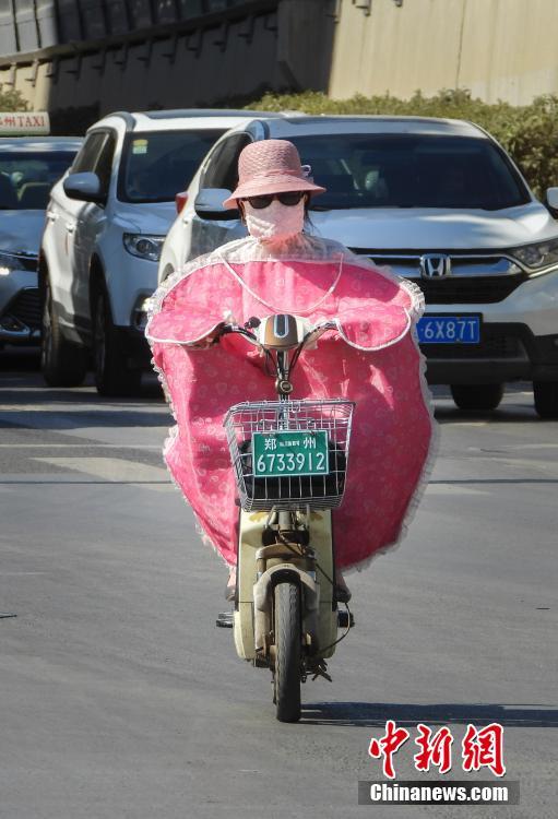 5月22日,河南郑州,街头骑车的市民穿着防晒衣、戴上遮阳帽出行。当日,河南郑州迎来入夏后的首个高温天气,烈日炙烤之下,当地最高气温达到37摄氏度。除了郑州,河南多地亦被高温笼罩,再加上大风助力,截至当日下午4时,河南省气象台连续发出158条干热风和高温预警。中新社记者 王中举 摄