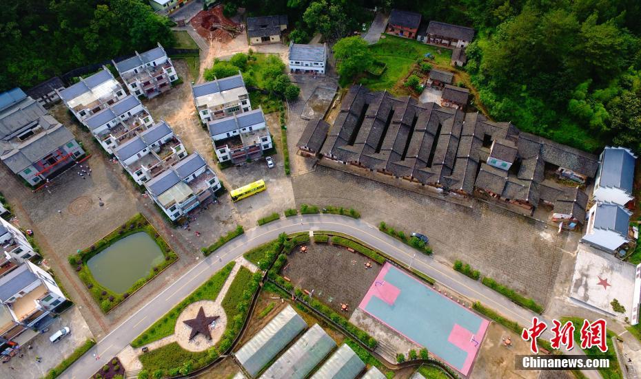 5月23日,无人机航拍江西瑞金市叶坪乡黄沙村华屋新貌,一栋栋新式三层小洋楼鳞次栉比,一路之隔的一间间饱经风霜的破旧土坯房也静静伫立。新旧对比,见证了华屋村的巨变。坐落于绿水青山中的华屋村,曾是一个贫困落后的小村落。在实施苏区振兴和精准扶贫后,这里的村庄发生了翻天覆地的变化,不仅新修建了公路和住房,并统一规划建设了大规模的蔬果大棚,成为远近闻名的乡村旅游点。中新社记者 刘占昆 摄