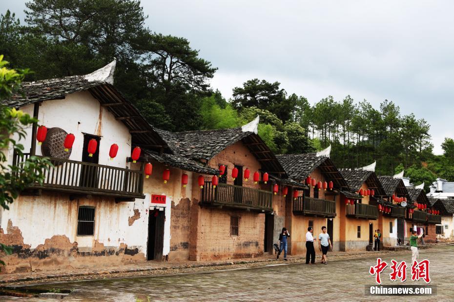 5月23日,在江西瑞金市叶坪乡黄沙村华屋,游客在保留下来的土坯房前参观。坐落于绿水青山中的华屋村,曾是一个贫困落后的小村落。在实施苏区振兴和精准扶贫后,这里的村庄发生了翻天覆地的变化,不仅新修建了公路和住房,并统一规划建设了大规模的蔬果大棚,成为远近闻名的乡村旅游点。中新社记者 刘占昆 摄