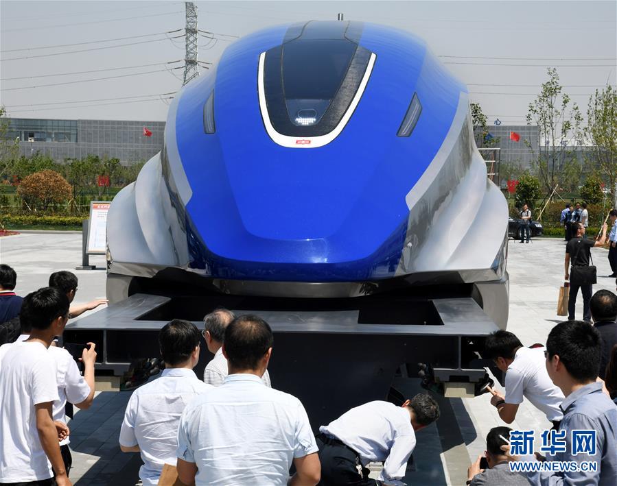 5月23日,人们在时速600公里高速磁浮试验样车下线仪式上参观。 新华社记者李紫恒摄